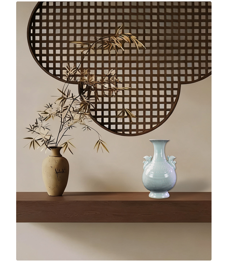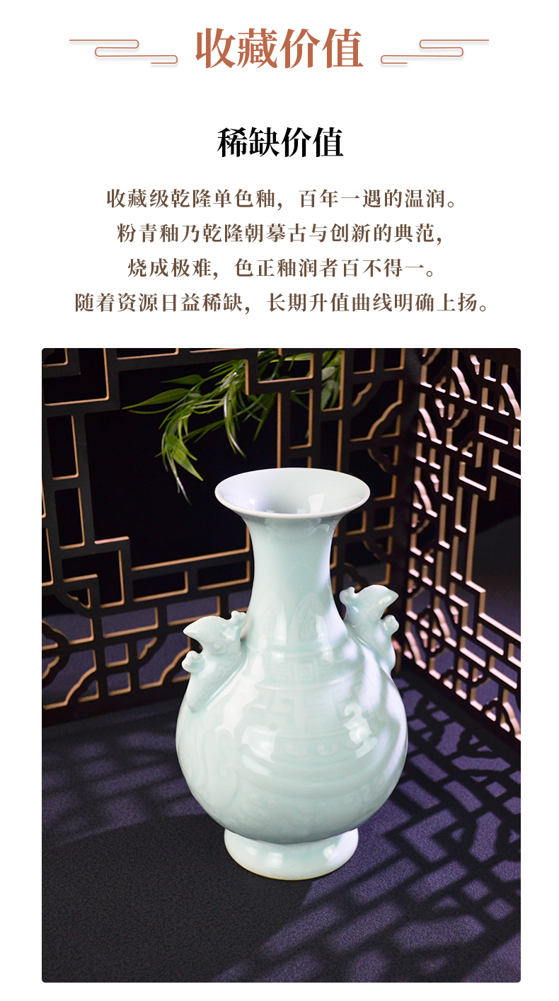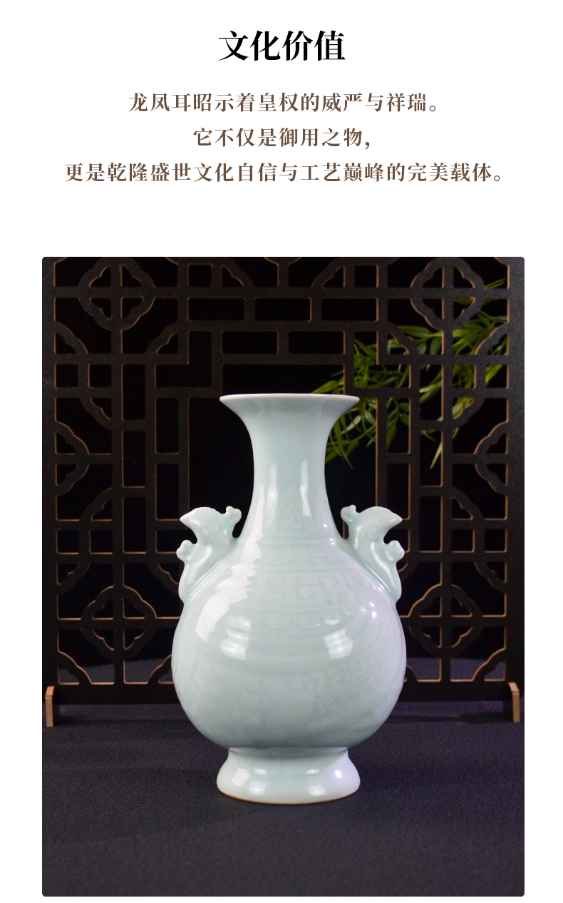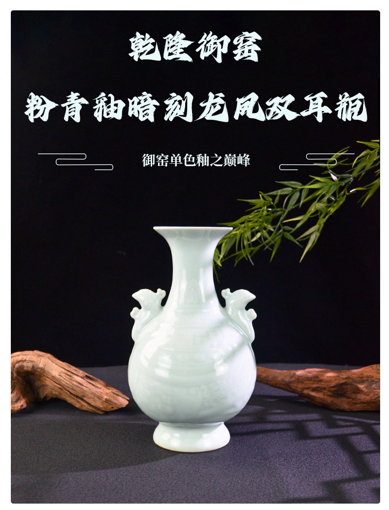 乾隆御窑·粉青釉暗刻龙凤双耳瓶