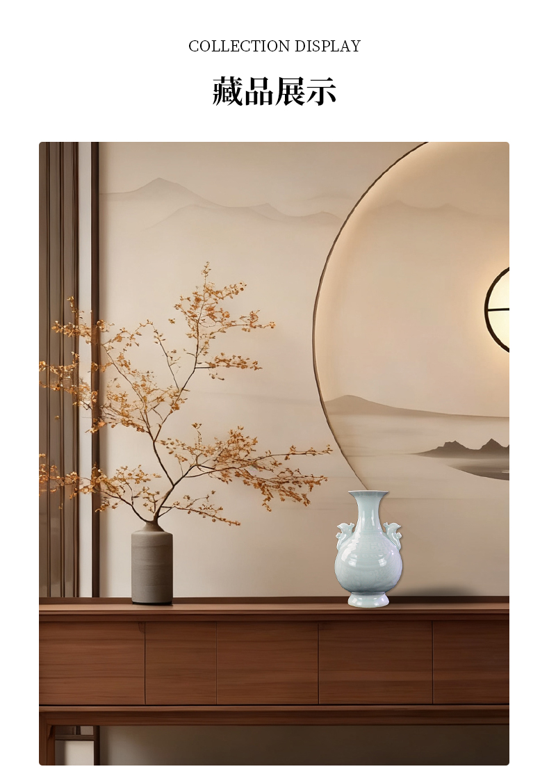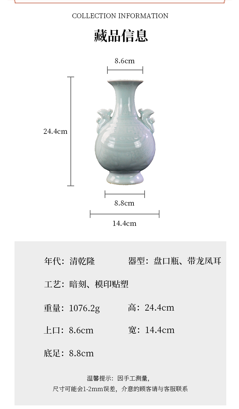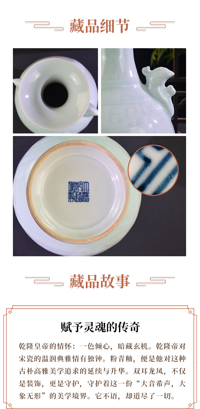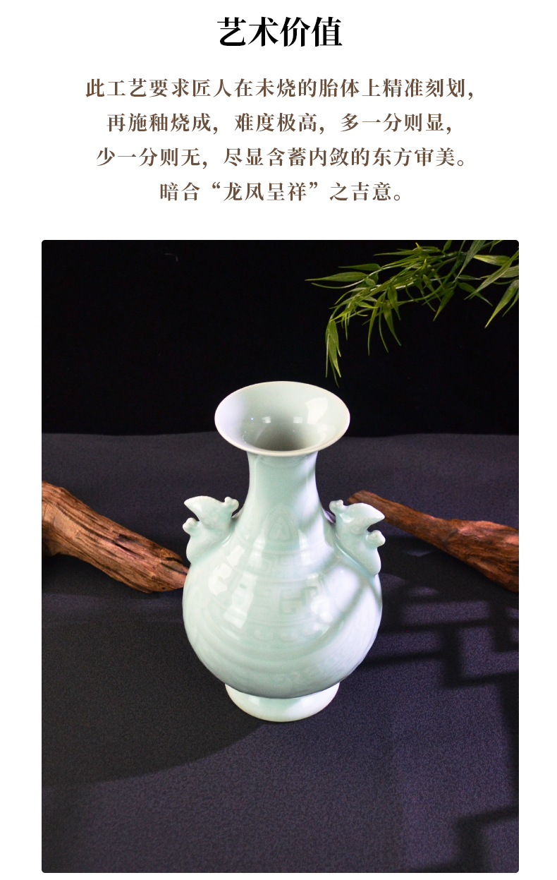 乾隆御窑·粉青釉暗刻龙凤双耳瓶
